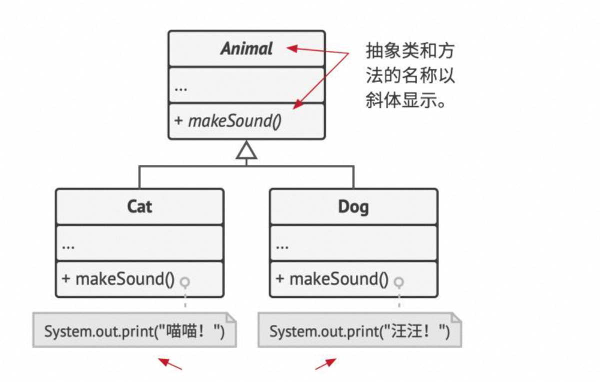 绝大部分 动物 Animals 可以发出声音。我们需要所有子类都重写基类的 makeSound发出声音 方法, 让每个子类都发出正确的声音, 因此我们可以马上将其声明为抽象。这让我们得以忽略父类中该方法的所有默认实现,从而强制要求所有子类自行提供该方法的实现。