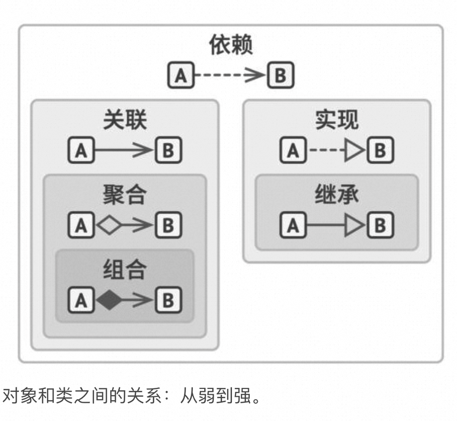 依赖是最弱、最宽泛的关系,表示一个类在某个方法中使用了另一个类(例如,作为参数、局部变量、或调用其静态方法)。