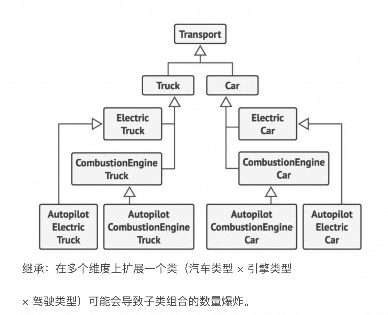 正如你所看到的,每个额外参数都将使子类数量倍增。子类中将有大量的重复代码,因为子类不能同时继承两个类