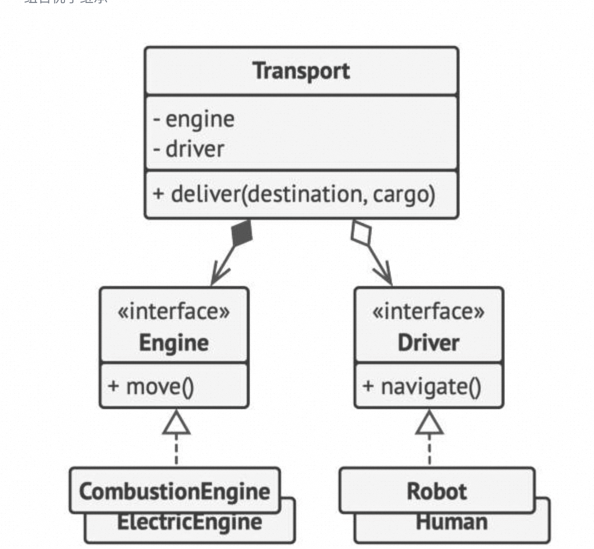 组合的还有一个好处是你可以在运行时对行为进行替换。例如,你可以通过重新为汽车对象分配一个不同的引擎对象来替换已连接至汽车的引擎。